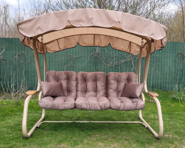 Гойдалка садова Валенсия Air 051 GreenGard з москітною сіткою - варіант преміум класу для відпочинку в саду української фабрики GreenGard. Тримісна гойдалка по типу ліжка з коливальним механізмом в коричневому кольорі з принтом вензелі подарують незабутні хвилини відпочинку в компанії рідних та друзів. Головною особливістю моделі є наявність захисного тенту, підлокітників, москітної сітки і можливість регулювати нахил спинки до лежачого положення. Так само додатково можна укомплектувати полицями для різних дрібниць. Більшого комфорту забезпечує м'який матрац. Міцний матеріал каркаса і якісний водовідштовхувальний текстиль забезпечують надійність і довговічність у використанні, а так само простоту в догляді.