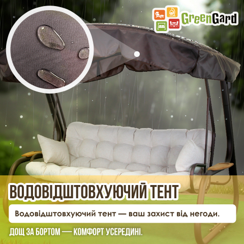 Гойдалка садова Домініка Air 058 GreenGard створює атмосферу спокійного, розміреного відпочинку на свіжому повітрі - місце, де можна на деякий час забути про справи, влаштуватися зручніше та дозволити літньому дню плинути своїм неквапливим ритмом. Простора конструкція розрахована на дружні розмови, сімейні вечори та тихі хвилини розслаблення в тіні тенту, м'яко погойдуючись серед зелені саду або на затишній терасі. Міцний каркас виконаний зі сталевої труби і розрахований на серйозне навантаження до 400 кг, завдяки чому гойдалка спокійно витримує відпочинок чотирьох дорослих людей одночасно. Коричневий відтінок каркаса і тенту виглядає благородно і гармонійно поєднується з природними відтінками саду, створюючи акуратний і стильний зовнішній вигляд. Габарити конструкції в зібраному вигляді становлять 2200 × 1630 × 2050 мм, що робить гойдалку досить просторою, але при цьому візуально легкою для розміщення на ділянці. Особливий комфорт забезпечує продумана конструкція сидіння. Спинку можна регулювати за нахилом, а за бажанням повністю розкласти, перетворивши гойдалку на зручне літнє ліжко. У розкладеному вигляді простір для відпочинку сягає 1800 × 1150 мм, дозволяючи розслабитися або навіть влаштувати невеликий денний сон. За необхідності механізм дозволяє зафіксувати положення та зупинити розгойдування. М'яка частина виконана з приємної та зносостійкої мікрофібри, яка добре зберігає зовнішній вигляд і комфортна на дотик. Верхня та нижня частини подушок зшиті між собою, тому вони залишаються на місці і не сповзають під час розгойдування або в розкладеному положенні сидіння. Наповнення з холлофайбера робить сидіння м'яким і пружним, створюючи відчуття легкості та затишку. Чохли передбачені знімними, що спрощує догляд і допомагає надовго зберегти насиченість кольору тканини. За захист від сонця та негоди відповідає тент з водовідштовхувальної тканини Oxford, який створює приємну тінь і захищає від легкого дощу. У комплект також входить антимоскітна сітка на всю площу каркаса, що дозволяє відпочивати без настирливих комах. За бажанням сітку можна акуратно підв'язати під козирком або повністю зняти. Доповнюють комплектацію декоративні подушки та зручні дерев'яні полички, на яких можна розмістити напій, книгу або телефон, щоб все необхідне для відпочинку завжди було під рукою. Домініка Air 062 GreenGard - затишний простір для відпочинку, де кожен вечір перетворюється на спокійний момент насолоди літнім повітрям.