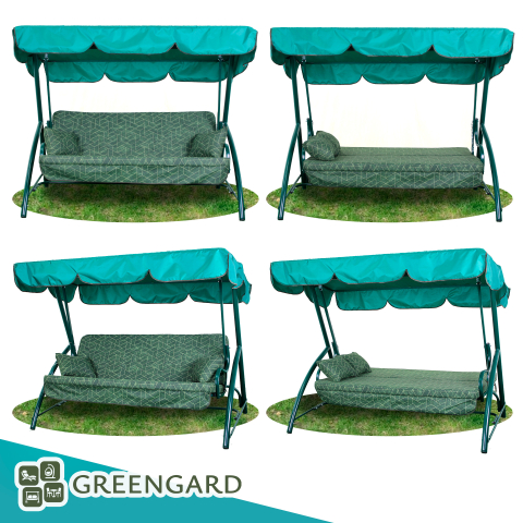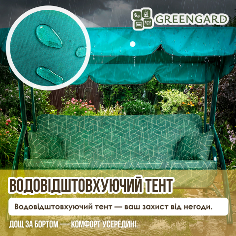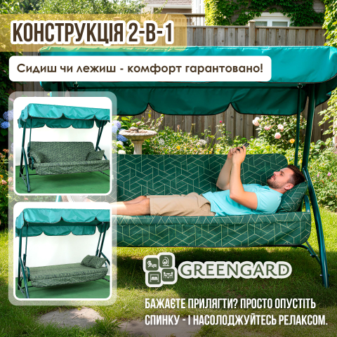 Гойдалка садова Елегія 007 GreenGard - тихий куточок відпочинку, який легко перетворює сад, терасу або дачний двір на місце, де хочеться затриматися довше. Спокійний зелений колір гармонує з природою, а м'які лінії конструкції створюють відчуття затишку та розслаблення. На гойдалці приємно провести ранковий годинник з книгою, влаштувати вечірні розмови з близькими або просто дозволити собі кілька хвилин відпочинку просто неба. Надійність конструкції починається з міцного каркасу із сталевої труби діаметром 51 мм із товщиною стінки 1,5 мм. Метал покритий полімерним захисним шаром, що допомагає зберігати акуратний зовнішній вигляд та захищає конструкцію від впливу погоди. Основа сидіння виконана зі звареної металевої сітки, що робить його стійким та довговічним навіть при регулярному використанні. Гойдалка розрахована на навантаження до 300 кг, тому на них вільно розміститься вся родина. М'яка частина створена для комфорту. Подушки наповнені поролоном товщиною 80 мм, завдяки чому сидіння залишається м'яким та підтримуючим. Чохли виконані із щільної тканини Бязь GOLD, яка приємна на дотик і добре зберігає форму. Верхня та нижня частини м'якого блоку з'єднані між собою, тому подушки не зміщуються під час гойдання або при розкладеній конструкції. Спинка регулюється та дозволяє змінювати положення залежно від настрою. У звичайному режимі це зручне сидіння для спокійного відпочинку, а при необхідності конструкція легко розкладається, перетворюючись на просторе літнє ліжко розміром 170 × 115 см. У такому положенні можна спокійно лежати, відпочивати або читати, зафіксувавши гойдалку від розгойдування. Доповнює конструкцію тент із водовідштовхувальної тканини Oxford, який захищає від сонця та легкого дощу. Його нахил регулюється до 60 °, тому тінь можна легко налаштувати під положення сонця протягом дня. Розміри гойдалок 2140×1250×1780 мм, а ширина сидіння 170 см дозволяє зручно розміститися трьом людям, створюючи достатньо простору для комфортного відпочинку. Елегія 007 GreenGard - місце, де кожен легкий помах гойдалок наповнює день спокоєм та теплом.