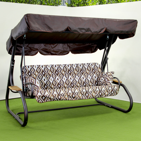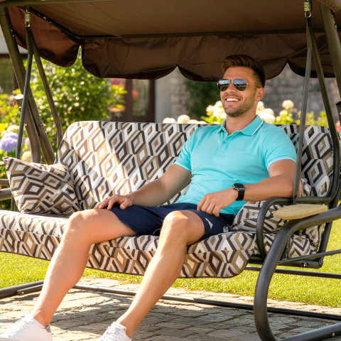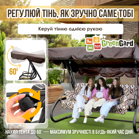Гойдалки садові Глорія 037-2 GreenGard - справжній центр тяжіння на терасі, в саду або у дворі. Вони відразу створюють відчуття затишку: глибокий коричневий тент, м'які подушки з виразним геометричним малюнком, солідний чорний матовий каркас - все виглядає сучасно, гармонійно і по-справжньому комфортно. Тут приємно почати ранок з чашкою кави, влаштуватися з книгою в тіні вдень або провести теплий вечір в компанії близьких. Простора конструкція розміром 2200×1600×2000 мм розрахована на чотирьох осіб і витримує навантаження до 400 кг, тому гойдалка відмінно підходить для сімейного відпочинку. Сидіння в складеному вигляді має розмір 1800×555 мм, а в розкладеному перетворюється на широке місце для відпочинку 1800×1150 мм. Конструкція 2-в-1 дозволяє легко змінювати сценарій використання: сидіти, розгойдуючись в приємному ритмі, або опустити спинку і влаштуватися майже як на літньому ліжку. Надійність моделі підкреслює міцний каркас зі сталевої труби діаметром 60 мм і товщиною 1,5 мм з полімерним покриттям. Чорний матовий колір виглядає строго і стильно, а сама конструкція справляє враження стійкої і добротної. Основа сидіння виконана з зварної сітки, що додає міцності і забезпечує впевнену підтримку при щоденному використанні. На окрему увагу заслуговує м'яка частина. Чохли з меблевого велюру приємні на дотик і роблять відпочинок особливо затишним, а наповнювач з поролону товщиною 80 мм створює виразну м'якість без відчуття зайвої пухкості. Геометричний візерунок «ромб» в теплій коричнево-бежевій гамі надає гойдалкам декоративності і робить їх помітним акцентом в зоні відпочинку. У комплекті передбачені зручні подушки, які додають посадці ще більше розслабленості. Тент з водовідштовхувальної тканини Oxford допомагає відчувати себе комфортно в різну погоду. Він захищає від палючого сонця і робить відпочинок спокійнішим, коли погода змінюється. Регулювання нахилу тенту дозволяє підлаштувати тінь під себе протягом дня, а коричневий відтінок красиво поєднується із загальною палітрою моделі, додаючи їй благородний і теплий характер. Невеликі дерев'яні полички з боків роблять використання ще зручнішим: під рукою можна тримати напій, телефон або книгу. GreenGard Глорія 037-2 - гойдалка, в якій міцність, м'якість і стиль поєднуються в одне велике задоволення від відпочинку.