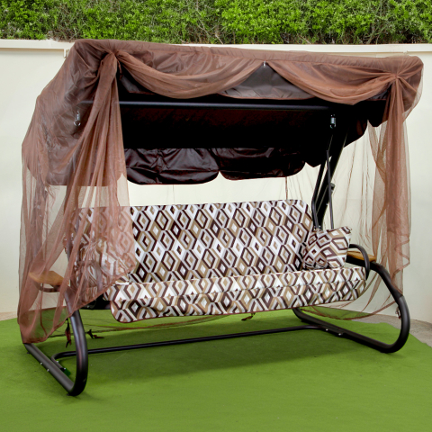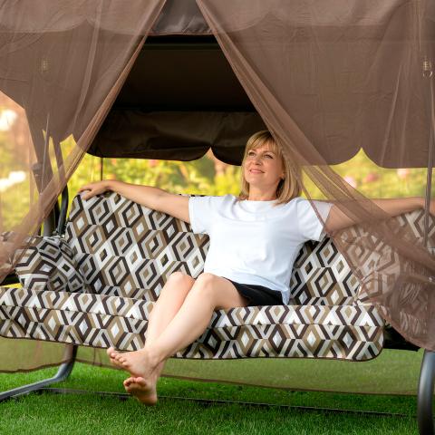 Гойдалка садова Глорія 037 GreenGard - той рідкісний формат відпочинку, де продумано все: простір, м'якість, захист від сонця і дощу, затишні деталі і відчуття власного лаунж-куточка прямо біля будинку. Вони відразу привертають погляд виразним силуетом, теплою палітрою текстилю і атмосферою спокійного комфорту, в яку хочеться зануритися всією сім'єю - вранці з кавою, вдень в тіні і ввечері в неспішній тиші саду. Простора конструкція розміром 2200 × 1600 × 2000 мм впевнено вміщує до чотирьох дорослих, а сидіння легко трансформується в повноцінне літнє ліжко, перетворюючи гойдалку зі звичайного місця для сидіння в зручну зону для розслабленого відпочинку лежачи. Міцний каркас виконаний зі сталевої труби діаметром 60 мм і доповнений полімерним покриттям в чорному матовому кольорі, тому модель виглядає солідно, сучасно і впевнено витримує щоденне використання. Максимальне навантаження до 400 кг робить її практичним рішенням для великої родини і дружніх посиденьок на свіжому повітрі. На окрему увагу заслуговує комфорт посадки. М'які подушки з меблевого велюру з геометричним малюнком наповнені поролоном товщиною 80 мм, завдяки чому поверхня залишається приємною, пружною і добре тримає форму навіть при інтенсивній експлуатації. Дві декоративні подушки додають ще більше затишку і підтримки, а сам текстиль виглядає виразно і робить гойдалку не просто зручною, а по-справжньому атмосферною. Верх гойдалки продуманий так, щоб відпочинок не залежав від примх погоди. Водовідштовхувальний тент з тканини Oxford допомагає сховатися від яскравого сонця і несподіваного дощу, а регульований нахил дозволяє змінювати положення тіні під себе протягом дня. Антимоскітна сітка створює додатковий комфорт у вечірні години, захищаючи від комах і зберігаючи відчуття відокремленого, закритого простору без задухи і тяжкості. Практичні деталі тут працюють на зручність кожен день. Бічні полички з натурального дерева виглядають особливо тепло і естетично, при цьому на них зручно поставити напій, покласти телефон або книгу - все необхідне залишається під рукою. Такий набір рішень робить модель особливо приємною у використанні: вона не тільки прикрашає ділянку, але і дійсно підлаштовується під ритм відпочинку. GreenGard Глорія 037 - гойдалка, в якій сад перетворюється на місце, звідки не хочеться йти.
