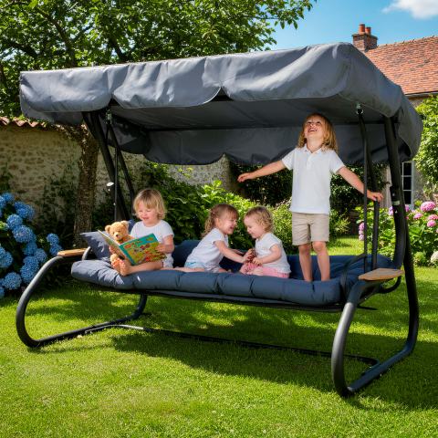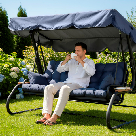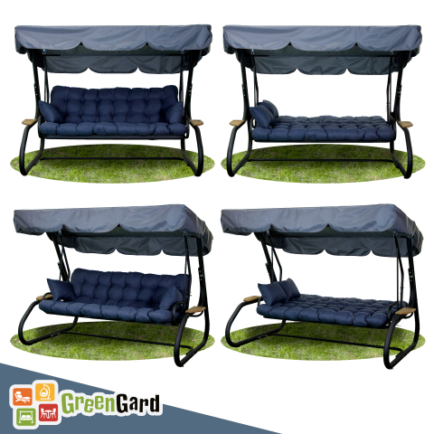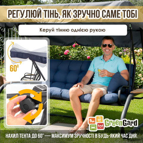 У саду, на терасі або у дворі завжди є місце, де хочеться зупинитися, розслабитися і відчути справжнє літо. Гойдалка GreenGard «Мішель» створює саме таку атмосферу - легку, затишну і трохи святкову. Сучасний силует, глибокий синій колір м'якої частини і лаконічний темний каркас виглядають стильно і гармонійно, перетворюючи звичайну зону відпочинку в комфортний простір для спокійних бесід, сімейних зустрічей або лінивих післяобідніх пауз на свіжому повітрі. Конструкція продумана так, щоб відпочинок був не тільки приємним, але і дійсно зручним. Просторі габарити 2200 × 1600 × 2000 мм дозволяють вільно розміститися декільком людям, а міцна рама зі сталевої труби діаметром 60 мм з полімерним покриттям в чорному матовому кольорі забезпечує стійкість і надійність. Гойдалка витримує навантаження до 400 кг, тому на ній легко розміститься вся родина або компанія друзів. Сидіння шириною 1800 мм дарує відчуття простору. У звичайному положенні воно зручне для сидіння і м'якого погойдування, а при необхідності легко розкладається в повноцінне літнє ліжко розміром 1800 × 1150 мм. Завдяки конструкції «2-в-1» досить опустити спинку - і гойдалка перетворюється в затишне місце для відпочинку лежачи, де можна розслабитися, почитати книгу або просто насолоджуватися теплим повітрям саду. Окрему увагу приділено комфорту м'якої частини. Подушки виконані з міцної рогожки насиченого синього відтінку - тканини з приємною фактурою і високою зносостійкістю. Наповнювач з холлофайбера робить їх м'якими і пружними: він добре тримає форму, не збивається і залишається комфортним навіть після тривалого використання. У комплект також входять дві додаткові подушки, які створюють підтримку для спини і додають відчуття домашнього затишку. Тент з водовідштовхувальної тканини Oxford захищає від яскравого сонця і легкого дощу. Нахил можна легко регулювати однією рукою, підлаштовуючи тінь під положення сонця - до 60°. GreenGard «Мішель» - садові гойдалки, а затишний острів відпочинку, де кожен літній день стає трохи довшим і приємнішим.