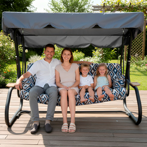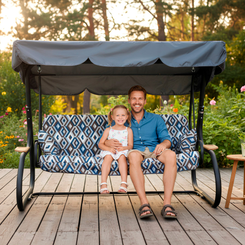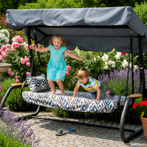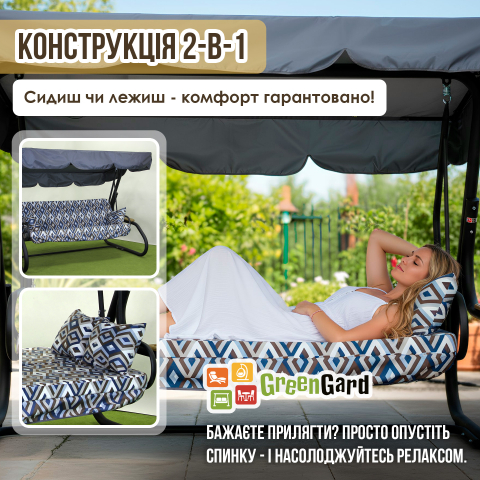 Гойдалка садова Ясмін 040-2 GreenGard створює відчуття тихого літнього куточка, де час ніби сповільнюється. Спокійний сучасний силует легко вписується в сад, на простору терасу або у двір заміського будинку, перетворюючи звичний простір в затишну зону відпочинку. Тут приємно почати ранок з чашкою кави, влаштувати неспішну розмову з близькими або просто закрити очі і дозволити м'якому погойдуванню віднести думки подалі від повсякденної метушні. Конструкція продумана так, щоб відпочинок був по-справжньому комфортним і універсальним. Просторі габарити 2200 × 1600 × 2000 мм дозволяють зручно розміститися відразу декільком людям - гойдалка розрахована на компанію до чотирьох дорослих і витримує навантаження до 400 кг. Широке сидіння розміром 1800 × 555 мм легко перетворюється на повноцінне місце для відпочинку: достатньо опустити спинку - і перед вами з'являється просторе літнє ліжко 1800 × 1150 мм, на якому можна розслабитися, витягнутися і насолодитися спокоєм. Основу конструкції становить міцний каркас зі сталевої труби діаметром 60 мм з надійним полімерним покриттям. Чорний матовий колір надає конструкції акуратний сучасний вигляд і добре поєднується з навколишнім ландшафтом. Метал стійкий до навантажень і розрахований на довгу експлуатацію на відкритому повітрі. Особливу атмосферу затишку створює м'яка частина гойдалки. Подушки виконані з меблевого велюру з виразним геометричним малюнком - тканина щільна, приємна на дотик і добре тримає форму. Всередині використовується поролон товщиною 80 мм, завдяки якому сидіння залишається пружним і комфортним навіть під час тривалого відпочинку. Декоративні подушки додають м'якості і роблять посадку ще більш розслабленою. Практичність конструкції помітна і в деталях. Спинка легко регулюється і фіксується в різних положеннях, дозволяючи вибрати зручний варіант - від спокійного сидіння до повноцінного відпочинку лежачи. Основа сидіння виконана з міцної зварної металевої сітки, яка забезпечує надійність конструкції і хорошу вентиляцію. Верхню частину доповнює широкий сірий тент з водовідштовхувальної тканини Oxford. Він захищає від яскравого сонця і літнього дощу, створюючи приємну тінь в будь-який час дня. GreenGard Ясмін 040-2 - місце, де сад перетворюється на простір відпочинку, а звичайний день - на маленьку відпустку.