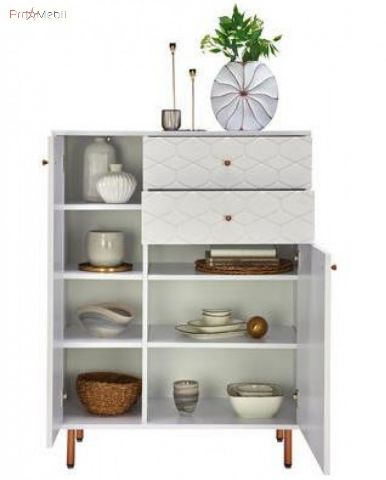 Практичным и функциональный комод KIM Botticelli станет прекрасным дополнением гостиной, спальни. Комод в своей конструкции имеет два закрытых отделения и четыре выдвижных ящика. Внутреннее пространство за дверцами разделено регулируемыми полками. Всего за двумя дверцами скрыто 5 полок. Дверцы навешены на петли с системой плавного закрывания Soft Close, а ящики монтированы на скрытые направляющие плавного выдвижения. Мебель KIM Botticelli характеризуется минималистическими формами, изящным геометрическим орнаментом на фасадах, миниатюрными точечными латунными ручками и ножками. Корпус и фасадные части изготовлены из МДФ толщиной 22 мм, и покрыты высокоглянцевой эмалью белого цвета. Внутренние полки изготовлены из ДСП толщиной 18 мм, также покрытые высокоглянцевой эмалью белого цвета.