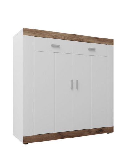 Стильний і практичний комод 1000 2Д/2Ш Санторіні Сокме збереже порядок у вашому домі і стане чудовим доповненням вітальні. Комод містить дві висувні шухляди і два закритих відділення з полицею всередині кожного. Колекція привертає увагу: мінімалістичним дизайном; елегантним поєднанням білого з верхніми і нижніми краями, що імітують натуральне дерево в кольорі «дуб вікінг»; строгим фрезеруванням фасадів; довгастими ручками сріблястого кольору; стійкими ніжками; фірмовими комплектуючими. Приголомшливі меблі Санторіні Сокме стануть справжньою окрасою як сучасного, так і традиційного інтер'єру.