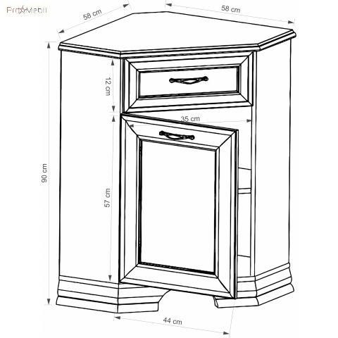 Тумба кутова 1D1S Tiffany Mebel Bos - це компактна модель, яка не займе багато місця у Вашій кімнаті, але забезпечить Вас місцем для зберігання різних речей. Тумбу можна використовувати як окремий елемент, так і комбінувати з вітриною-надставкою. Тумба містка, оснащена однією висувною шухлядою і закритим відділенням з полицею всередині. Корпус і фасадні частини виготовляються з високоякісного ламінованого ДСП з елементами з МДФ в ніжному відтінку вудлайн крем зі структурою, що імітує деревину. Торцеві поверхні всіх внутрішніх і зовнішніх елементів виробів облицьовані крайкою ABS, надаючи меблям завершений гарний і доглянутий вигляд. Колекція привертає увагу вишуканим, продуманим до дрібниць дизайном; світлим відтінком зі структурою деревини; витонченими рамковими фасадами з блискучою патиною; масивними декоративними карнизами, що прикрашають верх виробів; якісними металевими ручками сріблястого кольору; дизайнерськими ніжками декоративної форми з МДФ; фірмовими комплектуючими: накладні завіси з дотягом GTV Prestige і кулькові направляючі повного висунення забезпечують максимальну зручність у використанні. Тіффані Меблі Бос - вражаюча, непідвладна часу і завжди модна колекція, яка розкішно доповнить різний за призначенням інтер'єр, створить атмосферу тепла і затишку.