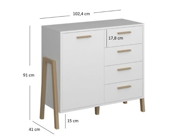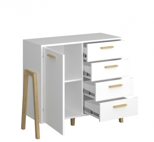 Чарівний комод 1D4S Бель біла ВМВ, яка впишеться практично в будь-який інтер'єр вітальні, спальні, молодіжної кімнати та домашнього кабінету, ставши джерелом натхнення і надавши інтер'єру оригінального характеру. Комод містить чотири висувні шухляди та одне закрите відділення з полицею всередині. Меблі привертають увагу своїм неординарним дизайном та цікавою формою; незвичайною асиметричною композицією; первозданним білим кольором; подовженими зручними ручками і високими ніжками, що виступають з боків, виготовленими з натурального дерева; фірмовими комплектуючими. Колекція Belle VMV порадує всіх любителів інноваційних ідей, а також сучасних, оригінальних та елегантних інтер'єрів, тих, хто цінує розкіш та комфорт у своєму будинку.