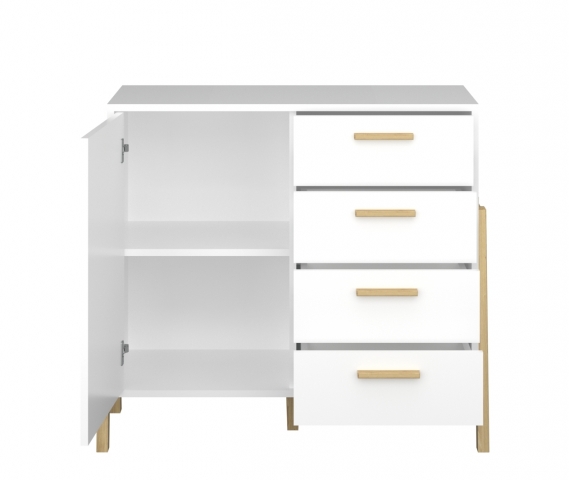 комод містить чотири висувні шухляди та одне закрите відділення з полицею всередині |