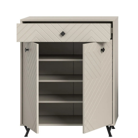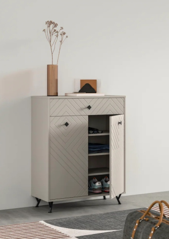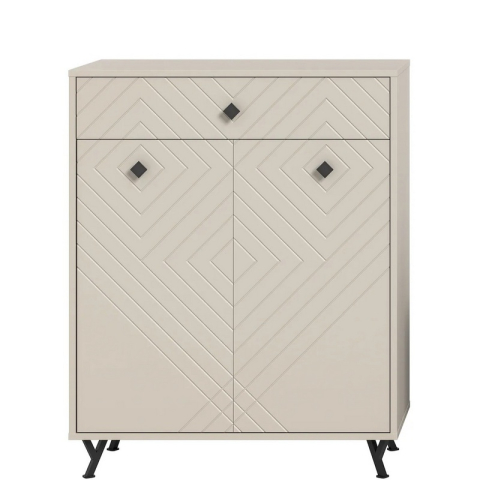 Комод 2Д1Ш Камео Сокме справжній шедевр витонченого стилю та елегантності, зразок інноваційних та ексклюзивних меблів, що ідеально підходять для створення світлої та гармонійної атмосфери в передпокої. Комод містить одну висувну шухляду і одне закрите відділення з полицями всередині, забезпечуючи зручне зберігання і підтримуючи порядок в інтер'єрі. Комод захоплює своїм унікальним дизайном: геометричним фрезерованим малюнком фасадів, що створює ефект глибини і тактильної виразності; спокійним пастельним тоном кашеміру, що наповнює простір теплом і витонченістю; темними металевими ручками-кнопками, що додають індустріальний шарм і підкреслюють сучасний характер меблів; темними металевими Y-подібними ніжками, що надають композиції візуальну легкість, зберігаючи при цьому надійність і стійкість конструкції, фірмовою фурнітурою. Камео кашемір Сокме - справжній витвір мистецтва, що створює простір, де кожна деталь надихає, а комфорт перетворюється на естетичне задоволення.