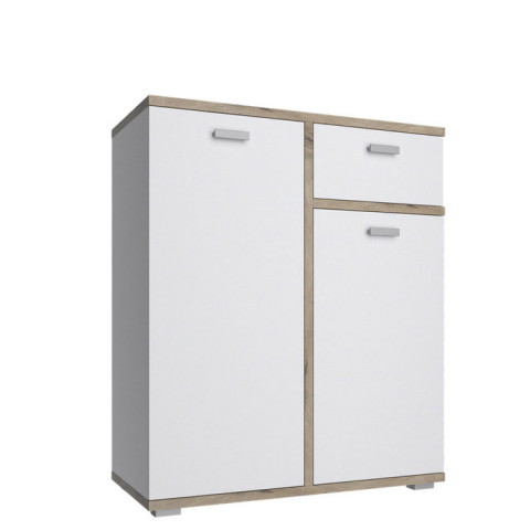 Комод 2Д1Ш Лаціо Сокме, в якому сучасна естетика, зручність і продуманість кожної деталі об'єднуються, формуючи стильний, гармонійний простір, що задає тон всьому будинку. Комод містить одну висувну шухляду і два закритих відділення з полицями всередині, забезпечуючи зручне зберігання повсякденного одягу та аксесуарів, а також підтримуючи порядок і акуратність у передпокої. Комод привертає увагу: лаконічним сучасним дизайном і елегантною простотою, що гармонійно вписується в будь-який інтер'єр; чіткими лініями; збалансованим контрастом світлих фасадів і дерев'яних вставок; акуратними довгастими ручками сріблястого кольору, що підкреслюють сучасний стиль; міцною конструкцією зі стійкими ніжками; а також фірмовою фурнітурою. Передпокій Лаціо Сокме створює атмосферу затишку і порядку, зустрічаючи вас продуманою ергономікою і вишуканою простотою кожен день.