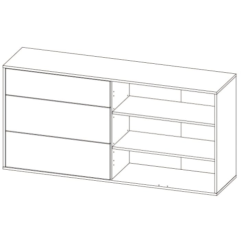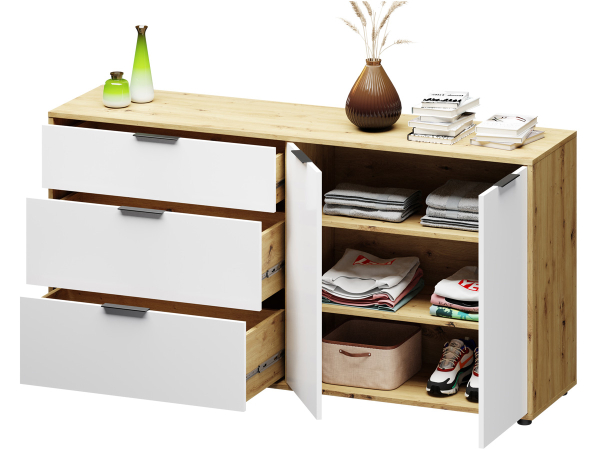 комод містить три висувні шухляди і одне закрите відділення з поличками всередині |