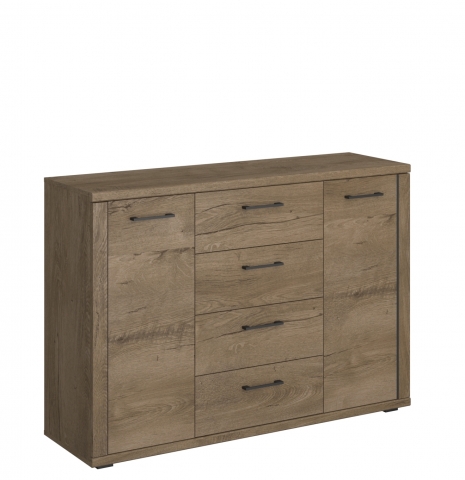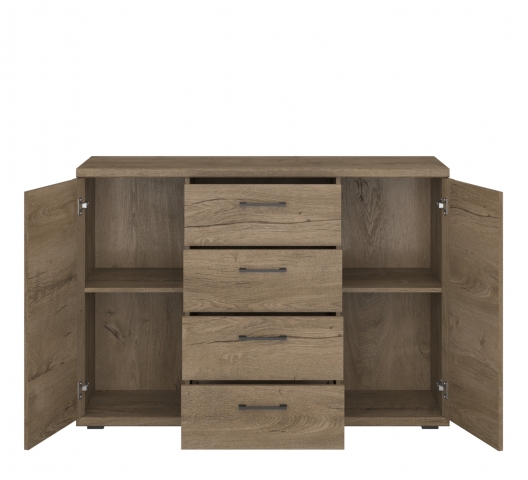 комод містить чотири висувні шухляди та два закритих відділення з полицею в кожному |
