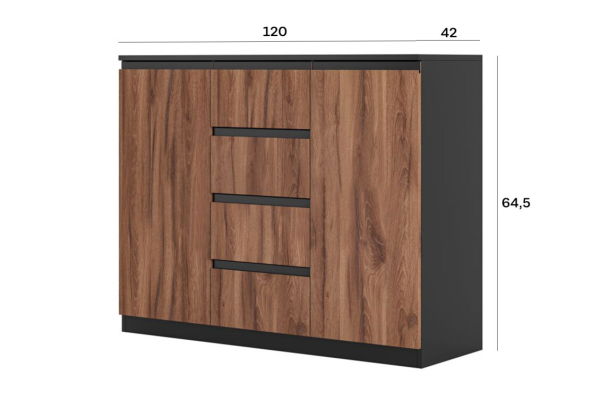 Комод 2Д4Ш Фріда Світ Меблів сміливе поєднання сучасного стилю та індустріальної естетики з нотками класичної елегантності, який привнесе в інтер'єр виразність, контрастність і витончену гармонію, даючи змогу створити унікальний простір у будь-якій кімнаті. Комод має чотири просторі висувні шухляди і два закритих відділення, пропонуючи бездоганну організацію зберігання, даючи змогу легко сортувати речі залежно від ваших потреб. Комод вражає суворим мінімалізмом, де лаконічні лінії та відсутність традиційних ручок створюють атмосферу стриманої елегантності, а фрезеровані виїмки на фасадах із контрастними планками стають стильними акцентами, водночас міцна основа гарантує стійкість, а фірмові комплектуючі забезпечують плавність і легкість в експлуатації. Меблі Фріда дуб ліворно Світ Меблів - справжній витвір мистецтва, що наповнить простір глибиною і виразністю, створюючи атмосферу затишку і гармонії в будь-якому куточку вашого будинку.