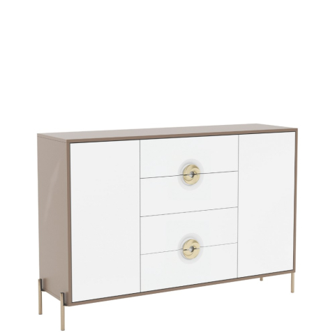 Комод 2Д4Ш Фуріоза Світ Меблів із сучасним і витонченим характером, що створює в спальні гармонійний і по-справжньому розслаблюючий простір. Комод містить чотири висувні шухляди і два закритих відділення, забезпечуючи зручне зберігання речей і підтримуючи акуратність в інтер'єрі. Меблі зачаровують з першого погляду: чіткими, вивіреними лініями; м'якою палітрою, що демонструє сучасну, мінімалістичну естетику; кольоровою гармонією білих і глиняних тонів, що створює відчуття спокою і умиротворення; двома варіантами відкривання - системою Push to Open і металевими напівкруглими ручками золотистого кольору; високими золотистими металевими ніжками, що підкреслюють елегантність і витонченість; якісною фурнітурою, яка робить використання комфортним і безшумним. Меблі Фуріоза Світ Меблів - нове прочитання елегантності, що наповнює спальню м'яким світлом, затишком і витонченим спокоєм.