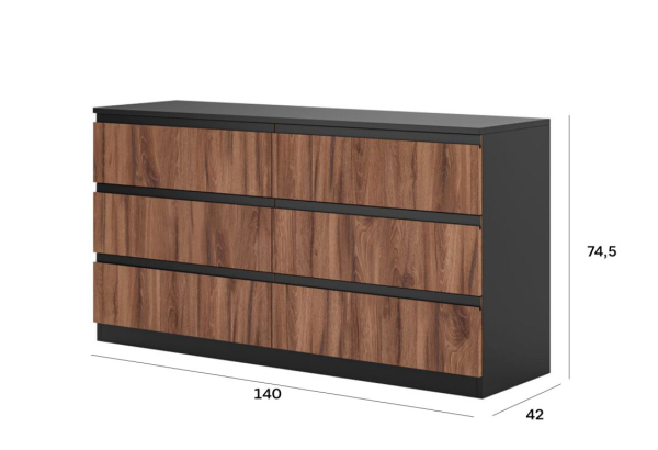 Комод 3Ш+3Ш Фріда Світ Меблів сміливе поєднання сучасного стилю та індустріальної естетики з нотками класичної елегантності, який привнесе в інтер'єр виразність, контрастність і витончену гармонію, даючи змогу створити унікальний простір у будь-якій кімнаті. Комод містить шість просторих висувних шухляд, пропонуючи бездоганну організацію зберігання, даючи змогу легко сортувати речі залежно від ваших потреб. Комод вражає суворим мінімалізмом, де лаконічні лінії та відсутність традиційних ручок створюють атмосферу стриманої елегантності, а фрезеровані виїмки на фасадах із контрастними планками стають стильними акцентами, водночас міцна основа гарантує стійкість, а фірмові комплектуючі забезпечують плавність і легкість в експлуатації. Меблі Фріда дуб ліворно Світ Меблів - справжній витвір мистецтва, що наповнить простір глибиною і виразністю, створюючи атмосферу затишку і гармонії в будь-якому куточку вашого будинку.