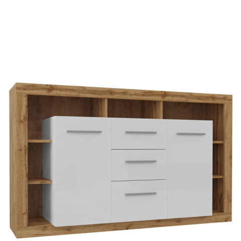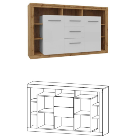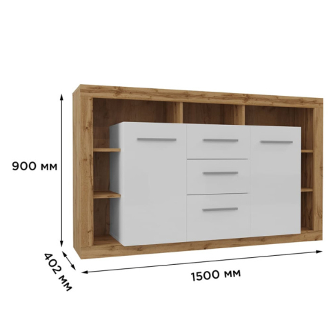 Комод 3Д2Ш Джерсі Сокме поєднує стиль і функціональність, створюючи витончений акцент в інтер'єрі вітальні і підкреслюючи її індивідуальність, атмосферу затишку і елегантності. Комод містить відкриті полиці, три закритих відділення і два висувних ящика, забезпечуючи зручне зберігання і легкий доступ до повсякденних речей і одночасно надаючи легкість і елегантність оформленню кімнати. Колекція привертає увагу: лаконічними лініями, ретельно вивіреними пропорціями і комфортною ергономікою, роблячи меблі не тільки красивими, але і зручними в повсякденному використанні; ефектним дизайном з контрастом білих глянцевих поверхонь і деревної текстури; продуманою ергономікою модулів, що забезпечують зручне зберігання; довгастими ручками сріблястого кольору, що підкреслюють сучасний стиль; міцною основою, що сприяє максимальній стійкості; фірмовими комплектуючими, що підвищують надійність і зручність використання. Джерсі Сокме дозволить створити гармонійний інтер'єр, наповнений теплом, світлом і продуманим комфортом.