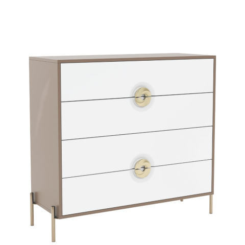 Комод 4Ш Фуріоза Світ Меблів із сучасним і витонченим характером, що створює в спальні гармонійний і по-справжньому розслаблюючий простір. Комод містить чотири висувні шухляди, забезпечуючи зручне зберігання речей і підтримуючи акуратність в інтер'єрі. Меблі зачаровують з першого погляду: чіткими, вивіреними лініями; м'якою палітрою, що демонструє сучасну, мінімалістичну естетику; кольоровою гармонією білих і глиняних тонів, що створює відчуття спокою і умиротворення; металевими напівкруглими ручками золотистого кольору; високими золотистими металевими ніжками, що підкреслюють елегантність і витонченість; якісною фурнітурою, яка робить використання комфортним і безшумним. Меблі Фуріоза Світ Меблів - нове прочитання елегантності, що наповнює спальню м'яким світлом, затишком і витонченим спокоєм.