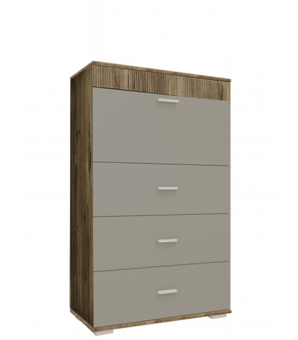 Практичний і місткий комод 800 Марк Сокме вдало поєднує в собі функціональність і незвичайний сміливий дизайн і призначений для облаштування вишуканої вітальні, їдальні та спальні. Комод підходить для зберігання будь-яких речей і включає в себе одне закрите відділення з відкидною дверцею і три висувні шухляди. Корпус і фасадні частини виготовлені з якісного ламінованого ДСП товщиною 16 мм з декоративними рифленими вставками з МДФ, в цікавому поєднанні кольорів дуб флагшток і шиншила сіра. Торцеві поверхні всіх внутрішніх і зовнішніх елементів виробів облицьовані крайкою ABS товщиною 0,5 мм, надаючи меблям завершений красивий і доглянутий вигляд. Комод привертає увагу елегантним мінімалістичним стилем; поєднанням двох відтінків; прямими чіткими лініями; довгастими пластиковими ручками; пластиковими ніжками; фірмовими комплектуючими: телескопічними напрямними і завісами без дотягу, які забезпечують максимальний комфорт у використанні. Меблі Марк Сокме практичні, ергономічні, легкі порадують шанувальників мінімалізму і сучасного стилю.