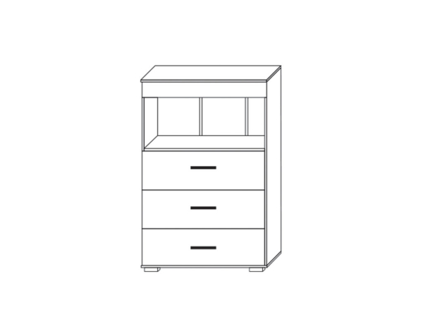 комод містить одне закрите відділення з відкидною дверцею і три висувні шухляди |