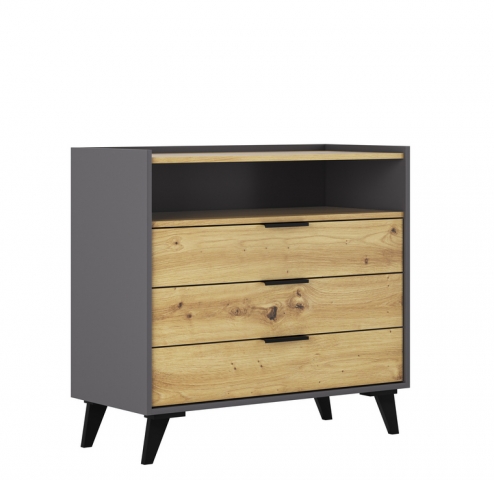 Комод Каміла Світ Меблів, що зачаровує вишуканою простотою та витонченістю, для облаштування інтер'єру спальні. Комод містить три висувні шухляди та одну відкриту нішу. Меблі привертають увагу неповторною аскетичністю; контрастним поєднанням графітового корпусу з вираженими фасадами з фактурою дерева "дуб артізан"; строгими і прямими лініями; довгастими ручками, інтегрованими в край фасаду; стійкими високими ніжками; фірмовими комплектуючими, які забезпечують максимальний комфорт у використанні. Меблі Каміла Світ Меблів - це ідеальне рішення для тих, хто віддає перевагу простоті та надійності, кому подобаються естетичні та креативні рішення.