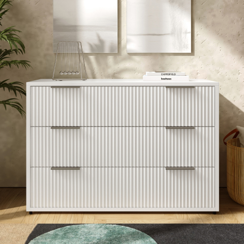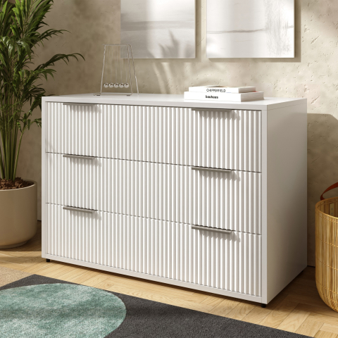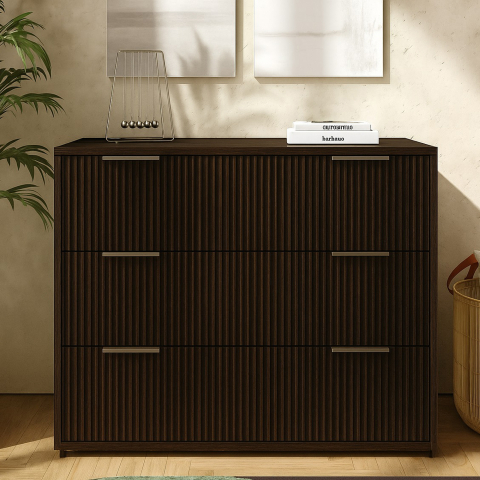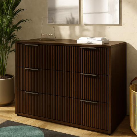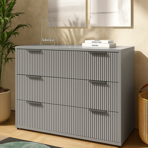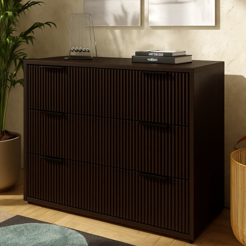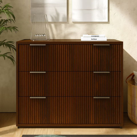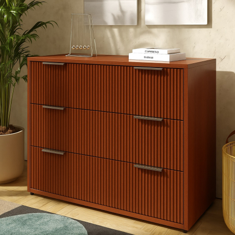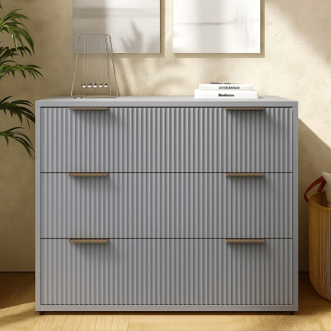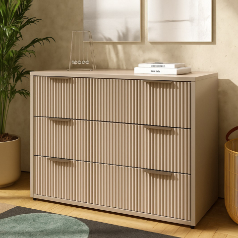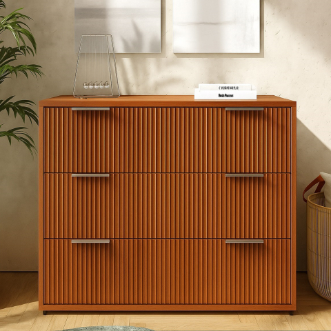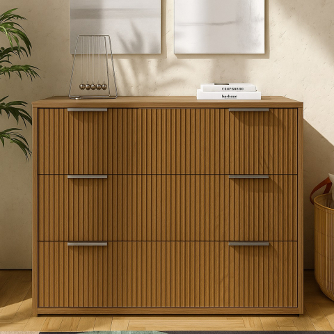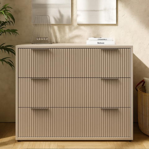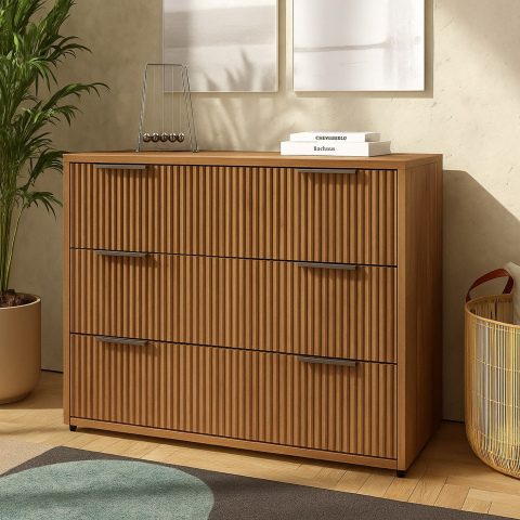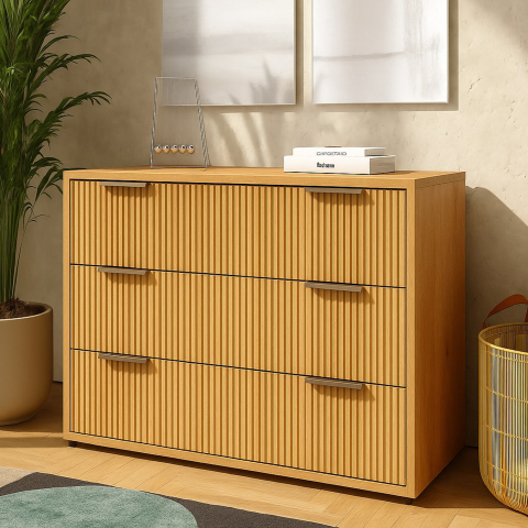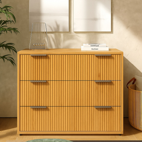 Комод Емілі Арбор Древ сучасна інтерпретація спокійної геометрії та теплої деревної фактури, яка привертає увагу ритмічними вертикальними лініями фасадів і м’якою, природною кольоровою гамою. Модель легко вписується в інтер'єр спальні, вітальні або дитячої кімнати, створюючи відчуття впорядкованості та візуального комфорту, де кожна деталь підтримує атмосферу затишку та гармонії. Внутрішній простір комода продумано для щоденної зручності та представлено трьома місткими висувними ящиками, які дозволяють акуратно розмістити одяг, текстиль та різні дрібниці, зберігаючи порядок і швидкий доступ до потрібних речей. Комод виготовлений з натурального меблевого щита бука або сосни на вибір і покритий гіпоалергенним лаком італійського виробництва, який підкреслює природну структуру дерева та захищає поверхню. Рельєфні фасади з чіткою вертикальною текстурою створюють виразну гру світла та тіні, додаючи глибини та характеру. Каркас шухляд виготовлений з ламінованого ДСП, задня стінка та дно виконані з ДВП, що забезпечує надійність конструкції, стійкість до навантажень та простоту в догляді. Серед особливостей моделі - виразний сучасний дизайн з акцентом на фактурні фасади; м'який розподіл світла по поверхні; лаконічні прямокутні форми, вишикувані в сувору горизонталь; акуратні металеві ручки зі зручним захватом; стійка основа; а також телескопічні напрямні повного висунення, що забезпечують плавний і тихий хід шухляд. Комод Емілі продумане поєднання естетики та практичності, яке робить повсякденний простір більш спокійним, організованим і приємним для життя.