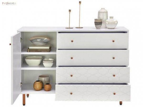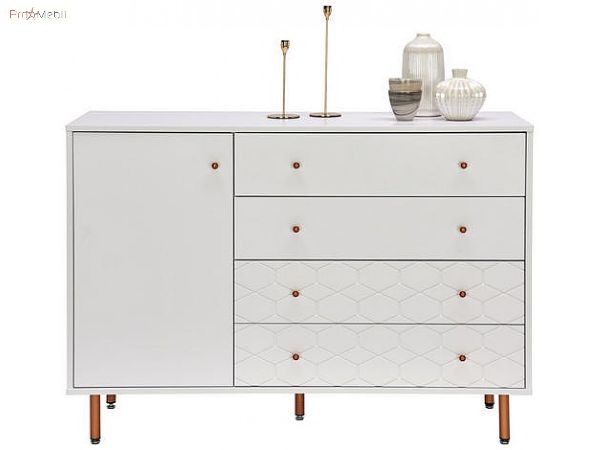 Практичным и функциональный комод KIM Botticelli станет прекрасным дополнением гостиной, спальни. Комод в своей конструкции имеет одно закрытое отделение и четыре выдвижных ящика. Внутреннее пространство за дверью разделено двумя регулируемыми полками. Дверцы навешены на петли с системой плавного закрывания Soft Close, а ящики монтированы на скрытые направляющие плавного выдвижения. Мебель KIM Botticelli характеризуется минималистическими формами, изящным геометрическим орнаментом на фасадах, миниатюрными точечными латунными ручками и ножками. Корпус и фасадные части изготовлены из МДФ толщиной 22 мм, и покрыты высокоглянцевой эмалью белого цвета. Внутренние полки изготовлены из ДСП толщиной 18 мм, также покрытые высокоглянцевой эмалью белого цвета.