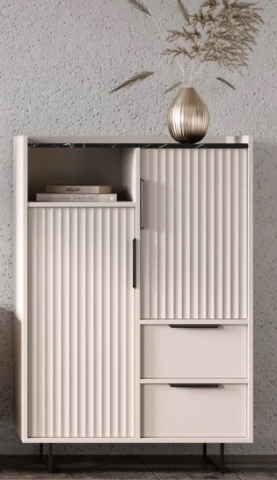 Неперевершений комод KOM2D2S Фреско ВМК (БРВ), сповнена шляхетною естетикою і сучасним шармом, створена для стильного і продуманого облаштування вітальні. Комод містить дві висувні шухляди, одну відкриту нішу і два закритих відділення: зліва за дверима встановлено дві полиці, праворуч розміщено одну полицю, забезпечуючи зручну систему зберігання для різних речей і підтримуючи порядок у приміщенні. Колекція приваблює рельєфними й фактурними вертикальними планками, що створюють ефект архітектурної глибини та гру світла й тіні на фасадах, підкреслюючи ритм і структуру поверхні; незвичним поєднанням витонченого відтінку «кашемір» з виразними стільницями «темний мармур», що додає колекції відчуття тепла, вишуканості й гармонії; металевими ручками чорного кольору, елегантно інтегрованими у фасади, які додають графічності, контрасту та динаміки усій композиції; високими металевими ніжками чорного кольору, які додають конструкції вишуканості й динаміки; високими металевими ніжками чорного кольору. Фреско кашемір/темний мармур - архітектура затишку, сповнена почуттям стилю, легкості та витонченого смаку.