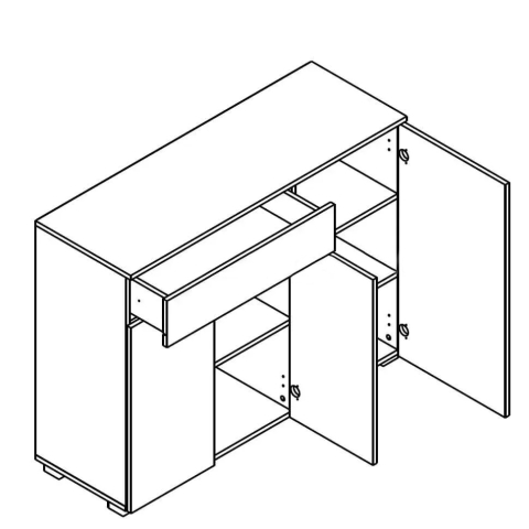 комод містить одну висувну шухляду і два закритих відділення: за центральними і лівими дверцятами розміщено одну полицю, у правому відділенні встановлено дві полиці |