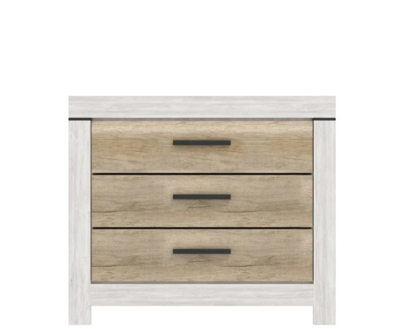 Комод KOM3S Белен Gerbor багатофункціональний і вміщує в себе величезну кількість речей. Комод - це не просто функціонально практичні меблі, а ще й гарний елемент інтер'єру. Комод прекрасно доповнить інтер'єр вітальні, їдальні, спальні та дитячої та допоможе в зберіганні різних речей, найчастіше таких як постільна білизна, одяг, рушники, дитячі іграшки та інші речі, в залежності від місця розміщення. Комод містить три висувні шухляди. Корпус і фасадні частини виробів виготовлені з ламінованого ДСП в ефектному кольоровому поєднанні з виразною текстурою: корпус - сосна каньйон, фасад - дуб корабельний. Меблі Белен Gerbor приваблюють: строгими геометричними формами; гладкими фасадами з потовщеним корпусом і боковинами, плавно перетікаючими в стійкі ніжки; металевими вставками і довгастими металевими ручками, що підкреслюють строгу геометрію форм; фірмовими комплектуючими: петлі з функцією тихого закриття і кулькові направляючі повного висунення забезпечують максимальну зручність у використанні. Меблі Белен Гербор призначені для тих, хто цінує сучасний дизайн і функціональні рішення, створюючи ергономічний і стильний простір в інтер'єрі.