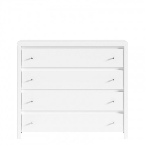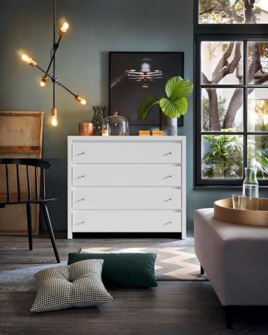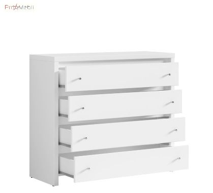 Білосніжний комод KOM4S Крістіна ВМК (БРВ) з вишуканим та елегантним скандинавським стилем для облаштування інтер'єру вітальні, спальні, дитячої, кабінету та передпокою відповідно до ваших уподобань. Комод містить чотири висувні шухляди. Комод привертає увагу поєднанням простого та оригінального стилю; кольоровим поєднанням корпусу німфея альба з білими глянцевими фасадами; правильними геометричними формами з оригінальним горизонтальним фрезеруванням на фасадах; акуратними металевими точковими ручками, сріблястого кольору; фірмовими комплектуючими: роликовими напрямними Hettich, що забезпечують максимальний комфорт у використанні. Меблі, що привертають до себе увагу, Крістіна ВМК (БРВ) - ця пропозиція для всіх, хто шукає неповторний інтер'єр своєї мрії.