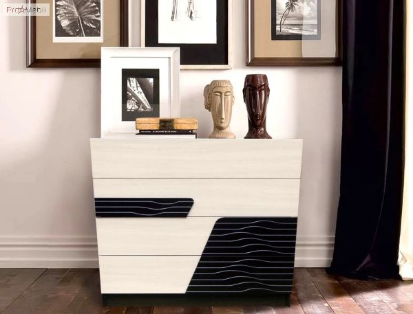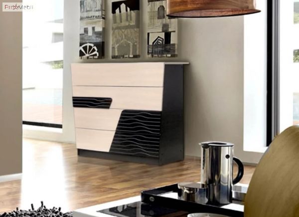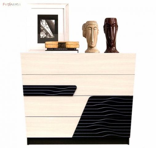 Комод Вектра Мастер Форм гармонично впишется в интерьер гостиной комнаты и станет полезным функциональным предметом мебели, позволяющим разместить необходимые вещи. Комод содержит четыре выдвижных ящика. Комод выпускается в интересном сочетании венге магия/дуб молочный. Корпус изготовлен из качественного ламинированного ДСП. Фасад изготовлен из качественного ламинированного ДСП с накладками МДФ. Комод характеризуется простыми прямоугольными формами, контрастными вставками, отсутствием ручек, их роль выполняет верхний торец фасада, регулируемыми опорами и роликовыми направляющими.