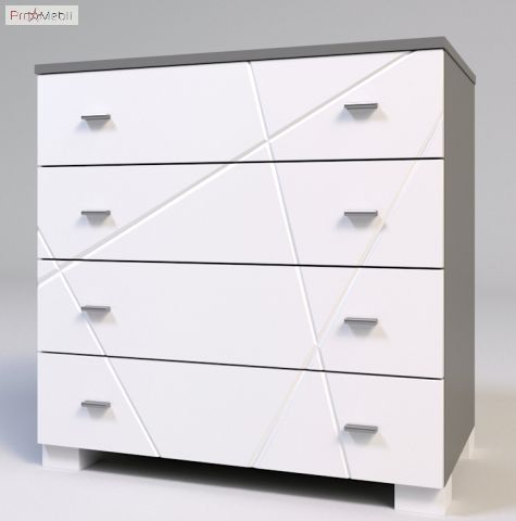 Практичний комод Х-05 X-Скаут Санті напевно стане в нагоді не тільки для зберігання предметів побуту, а й для стильного оформлення інтер'єру. Комод з чотирма висувними шухлядами забезпечує функціональне місце для зберігання Ваших речей. Ви можете покласти одяг, документи та багато іншого. Практичну стільницю можна використовувати в якості основи для лампи або букета зі свіжих квітів. Корпус виготовляється з високоякісного ДСП товщиною 18 мм австрійського виробника «EGGER», фасади - МДФ c фрезеруванням товщиною 16 мм виробництва Італія. Торці деталей обклеюються кромкою ПВХ фірми Rehau. Меблі X-Скаут Santi випускаються в контрастному поєднанні «сірого матового» корпусу з «білими матовими» фасадами. Характерними особливостями меблів X-Skaut Santi є сучасний дизайн, прості геометричні форми модулів, елегантне фрезерування на фасадах, стильні довгасті пластикові ручки, фірмові комплектуючі німецького виробника Hettich і телескопічні направляючі повного висунення. Меблі X-Скаут Санті це спосіб унікального аранжування інтер'єру дитячої кімнати, в якій Ви створите унікальний, наповнений легкістю лофт-інтер'єр.