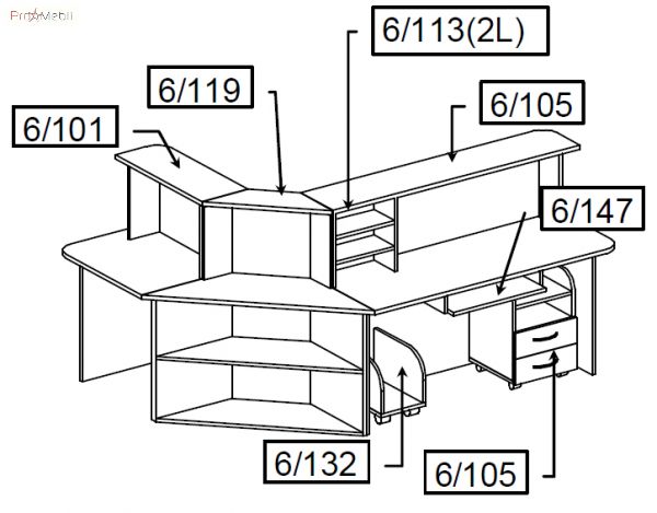 Комплектация: стол завершающий 6-101 - 1 шт. угловой модуль 6-119 - 1 шт. стол завершающий 6-105 - 1 шт. полка внутреннняя 6-113 2L - 1 шт. полка под клавиатура 6-147 - 1 шт. подставка под системный блок 6-132 - 1 шт. тумба мобильная 6-127 - 1 шт. декор накладка дсп 6-145 - 4 шт.