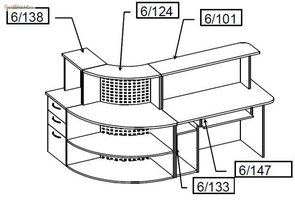 Комплектация: тумба стационарная 6-138 - 1 шт. угловой модуль 6-124 - 1 шт. стол завершающий 6-101 - 1 шт. полка под клавиатуру 6-147 - 1 шт. подставка под системный блок 6-133 - 1 шт. декор накладка металлик 6-146 - 4 шт.