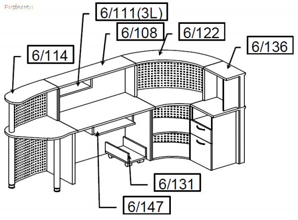 Комплектация: приставной элемент 6-114 - 1 шт. стол соединяющий 6-108 - 1 шт. полка под клавиатуру 6-147 - 1 шт. подставка под системный блок 6-131 - 1 шт. полка внутренняя 6-111 3L - 1 шт. угловой модуль 6-122 - 1 шт. тумба стационарная 6-136 - 1 шт. декор накладка металл 6-146 - 4 шт.