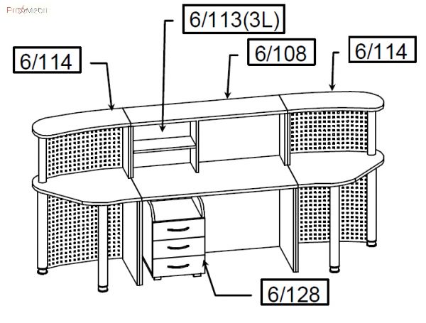 Комплектация: приставной элемент 6-114 - 2 шт. стол соединяющий 6-108 - 1 шт. полка внутренняя 6-113 3L - 1 шт. тумба мобильная 6-128 - 1 шт. декор накладка металл 6-146 - 2 шт.