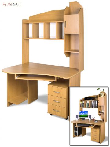 багато полиць, закрите відділення, висувна полиця для клавіатури, мобільна тумба з трьома висувними шухлядами, відділення під системний блок |