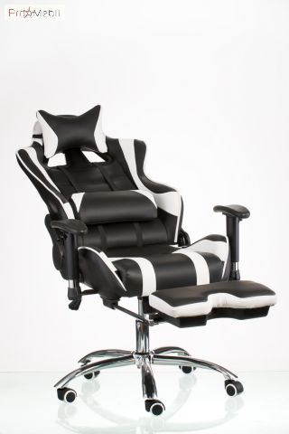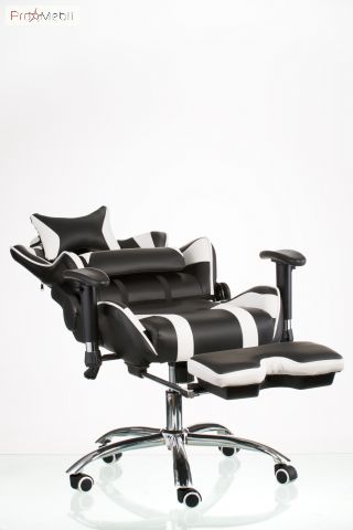 геймерське крісло біло-чорного кольору з поперековим валиком і подушкою-підголовником, обидві подушки мають анатомічну форму і кріпляться за допомогою спеціальних ремінців. час проведення за комп`ютером у положенні напівлежачи |
