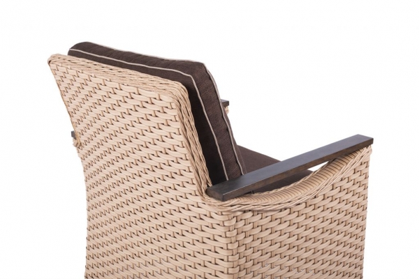 Крісло зі штучного ротанга Бридж Pradex - комфортне, до того ж ще й багатофункціональне, стане ідеальним варіантом для спокійного відпочинку на літніх терасах та присадибних ділянках. Крісло додатково комплектується подушкою на сидіння товщиною 10 см і декоративною подушкою розміром 60x50 см у стандартній комплектації з тентової тканини з вологовідштовхувальним просоченням Oxford, з можливістю виготовлення у всіляких кольорах і текстурах тканин на вибір - жаккард, велюр, дралон. При виготовленні меблів використовуються довговічні матеріали: легкий алюмінієвий каркас з порошковим покриттям, який не піддається корозії, заплітається практичним штучним ротангом преміум-класу, а також елементи з дерева. Штучний ротанг (техно ротанг) – сучасний, екологічно чистий та легкий матеріал, виготовлений із суміші різних полімерів на основі поліетилену. При виготовленні ротангових стрічок використовуються спеціальні добавки, завдяки чому матеріал отримує багато суттєвих переваг в експлуатації: не боїться опадів, перепадів температур, грибків та паразитів, не вигоряє на сонці та зберігає свій первісний вигляд довгі роки. Садові меблі привертають увагу міцністю; комфортністю; легкістю у догляді; зносостійкість; унікальністю моделей, які можна купити в різних варіаціях плетіння, формах, кольорах та розмірах. Бридж Pradex призначена для використання на відкритому повітрі або всередині приміщення, що привабить відвідувачів та наголосить на респектабельності закладу.