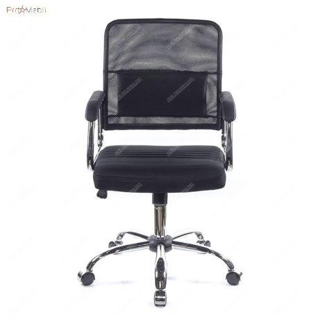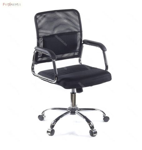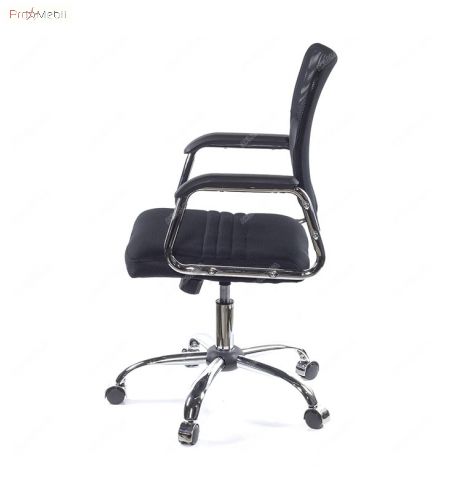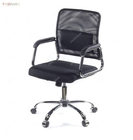 - Классический чёрный цвет и необычная эргономичная форма конструкции удачно сочетаются в данной модели. Цельногнутая металлическая труба использована в качестве каркаса спинки. На неё одет чехол из сетки. Такая комбинация очень прочная и в то же время лёгкая и воздушная. Сочетание чёрного цвета обивки и хромированных деталей делает эту модель универсальной, оно отлично послужит для дополнения скучного офисного интерьера.