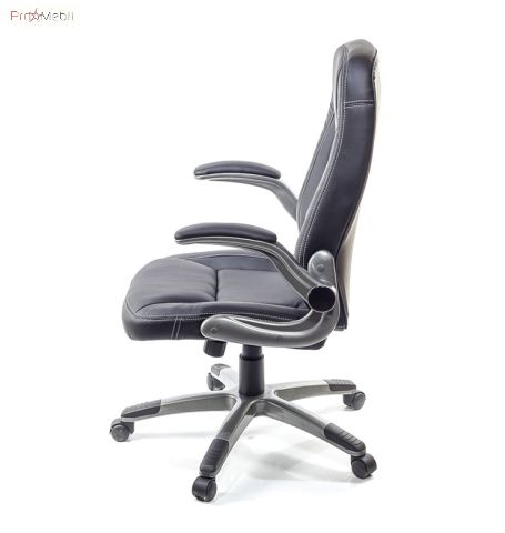 - В данной модели установлены массивные пластиковые подлокотники с мягкими накладками. Такие подлокотники вы можете часто видеть на геймерских креслах, что подтверждает их удобство и привлекательный внешний вид. При необходимости их можно поднять в вертикальное положение, что даст возможность максимально приблизится к столу или задвинуть кресло под стол, когда оно не используется. Мягкие накладки подарят вашим рукам комфортную и надежную опору. Красивый серебристый цвет подчеркивает современный дизайн кресла и перекликается с цветом крестовины. Место крепления подвижной части подлокотников скрыто черной круглой накладкой.