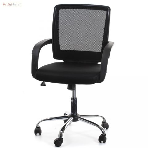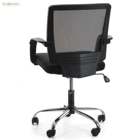 офісне крісло зі спинкою сіткою та м`яким сидінням чорного кольору має пластикові підлокітники |