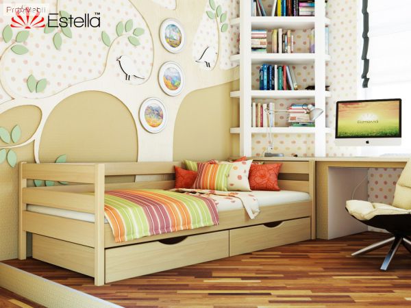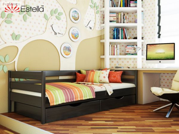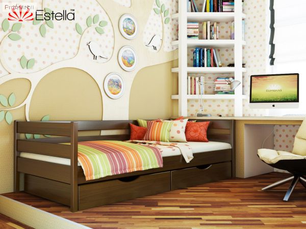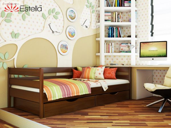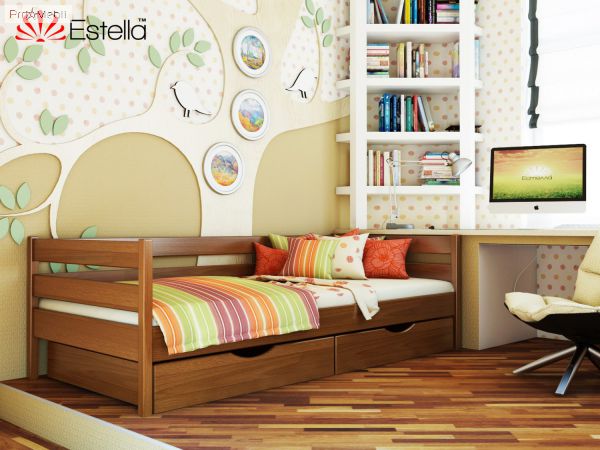 Кровать Нота 90x190 - односпальная детская или подростковая кровать украинской фабрики Эстелла. Выполнена из натурального дерева щита или массива бука на выбор. Выпускается в 8 оттенках, каждый из которых идеально впишется в интерьер спальни. Главными особенностями модели являются защитная спинка, ортопедическое основание и возможность укомплектовать ящиками для белья. Прямые лини, отсутствие лишних деталей и комфорт - бесспорные достоинства модели. Кровать комплектуется прочными гнутыми ламелями из ламинированной фанеры толщиной 8 мм. Благодаря особой изогнутой форме, ламели обеспечивают дополнительный ортопедический эффект и комфорт. Спальное место под матрас в размере 90х190 см обеспечит комфортный сон для одного ребенка или взрослого.
