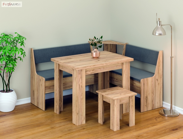 Кухонний куточок Роман Сокме - додасть приміщенню чарівності, зробить образ кухні закінченим і повним. Такий куточок стане вдалою знахідкою і підійде до будь-якого інтер'єра. Він повною мірою відповідає всім ергономічним вимогам. Корпус виготовлений з якісного ламінованого ДСП товщиною 16 мм, в світлому дерев'яному відтінку дуб сонома з оздоблювальним матеріалом мікро-рогожка Саванна Нова "Антрацит". Торцеві поверхні всіх внутрішніх і зовнішніх елементів виробів облицьовані крайкою ABS товщиною 0,51 мм, надаючи меблям завершений гарний і доглянутий вигляд. Куточок привертає увагу елегантним мінімалістичним стилем; простими прямокутними формами; фірмовими комплектуючими: завісами без дотягу Hafele, які забезпечують максимальний комфорт у використанні.