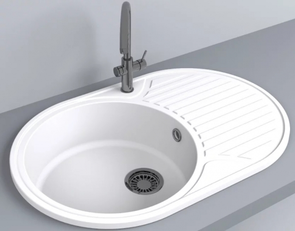 Кухонна мийка Fancy Marble Vermont біла - врізна овальна мийка з литого каменю. Мийка для кухні Fancy Marble Yuta - містка та практична модель з однією об'ємною чашею та ребристим неслизьким крило для сушіння посуду. Отвору під змішувач немає. В комплект входить: кухонна мийка, посібник користувача, кріплення (на мийці), сифон, заглушка отвору 35 мм. Композитний матеріал складається з поліефірної смоли та мінералів (кварц пісок, подрібнений мармур). Завдяки наповнювачам матеріал міцний, завдяки смолі добре тримає форму. Мийки чудово підходять для домашнього використання: нарізайте на ній овочі та фрукти, мийте в ній посуд, використовуйте так, як заманеться. Вона чудово впорається з поставленим завданням!
