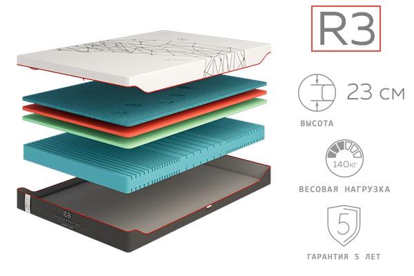 Матрац R3 150x200 української фабрики Come-for - відноситься до преміум лінійки матраців серії Regeneration. Ключова ідея даної серії матраців - посилити природні здібності організму до відновлення. Модель оснащена технологією BioRytmic, яка дозволила інтегрувати в структуру тканини молекули природних мінералів, що підвищує здатність концентрації і контролю тіла, а також підвищує стійкість до стресів. Основа матраца - безпружинний моноблок з пятизонної контурної різкою. Основним шаром комфорту виступає матеріал Memory Gel. Він є гібридом Visco Memoryі техногель і поєднав у собі їх кращі властивості. Він чудово повторює контури тіла, рівномірно розподіляє тиск, забезпечує терморегуляцію. Memory Gel ефективно поглинає тепло, довше залишаючись прохолодним. Особливістю матраца є технологія Ultra Comfort. Вона заснована на принципі поєднання матеріалів з метою надати виробу "розумні" властивості. Матраци, вироблені за даною технологією використовують сильні сторони декількох настильних шарів, пропонуючи Комфорт, Гнучкість, Підтримку і Анатомічність, яку неможливо досягти застосуванням одного монолітного шару матеріалу. Технологія ThermoControl відповідає за збереження комфортної температури під час сну. Матрац не тільки довше залишається прохолодним в жарку пору, а й зберігає тепло ліжку при різкому зниженні температури. Всі тканини і настилочні шари абсолютно гіпоалергенні і мають міжнародні сертифікати безпеки.