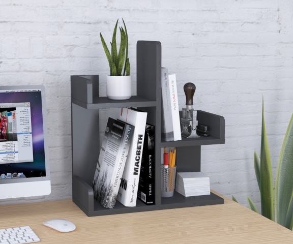 Надставка для письмового столу NS-3 від компанії Loft Design – відмінне рішення для організації вашого робочого місця. Ви зможете скласти в неї всі блокноти та зошити наприкінці робочого дня. На нижніх ярусах можуть поміститися робоче приладдя, книги або візитки з кульковими ручками. На верхніх ярусах можна розташувати елементи декору, горщик для квітів або пенал для канцелярії. Саму надставку можна поставити у вільний кут столу, де вона не заважатиме. Матеріал виготовлення – ламіноване ДСП у кольорі антрацит товщиною 18 мм. Надставка NS-3 – повноцінна альтернатива настінної полиці. У той же час це витончена стильна річ, яка підкреслить ваш нестандартний підхід до оформлення робочого простору.