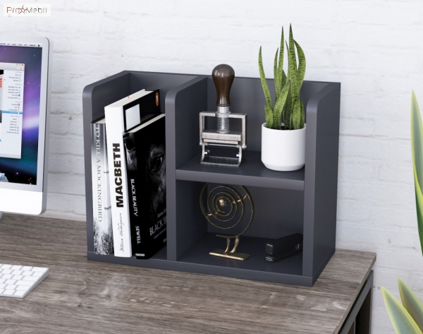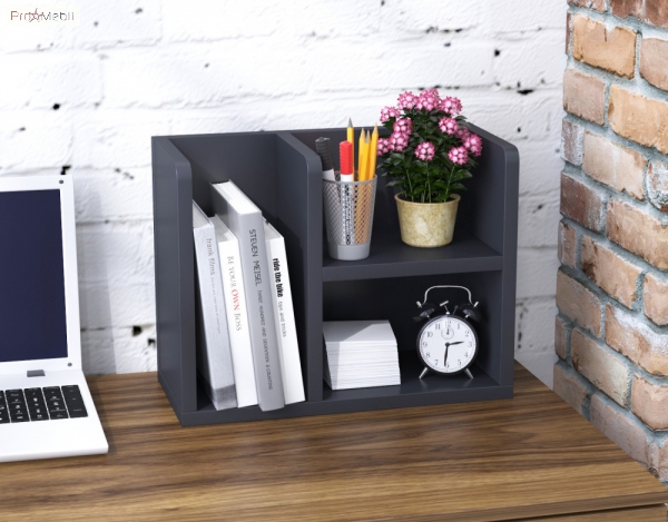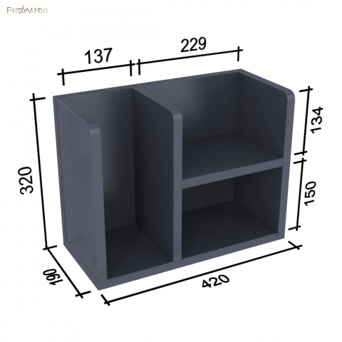 Надставка NS-5 - повноцінний замінник настінної полиці. У той же час, це витончена стильна річ, яка підкреслить ваш унікальний смак і нестандартний підхід до оформлення робочого простору. Надставка складається з трьох полиць: вертикальна має розміри 137х190х320 мм, верхня горизонтальна - 229х190х134 мм, нижня горизонтальна - 229х190х150 мм. Краї надставки покриті кромкою 0,5 мм. Це справжня знахідка, зручна у використанні як для роботи, так і для навчання. У надставки є відділення для необхідних дрібних предметів, елементів декору, зошитів або книг, а в невисокі широкі ніші можна ставити квітковий горщик. Саму надставку можна поставити у вільний кут стола, де вона не буде заважати. Матеріал виготовлення - ламіноване ДСП в кольорі антрацит, виробництва Egger (Австрія) товщиною 18 мм.