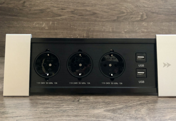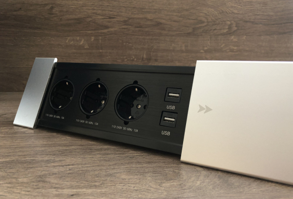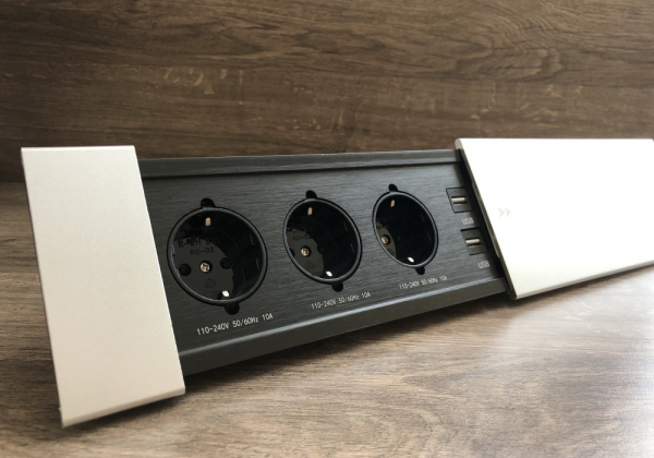 Настільна розетка 280×100 мм — стильне і функціональне рішення для переговорних і офісних столів, а також будь-яких робочих поверхонь, де важливо зберегти акуратний зовнішній вигляд без зайвих проводів. Завдяки лаконічному дизайну і нейтральній сіро-чорній гамі, вона легко впишеться в сучасний інтер'єр. Корпус виконаний з міцного алюмінію з приємною матовою текстурою. Кришка відкривається вбік, відкриваючи доступ до вбудованих роз'ємів. Зручно, коли потрібно швидко підключити техніку або зарядити гаджети прямо на столі. Вбудовані роз'єми: 3 розетки 220 В, 2 USB-порти (потрібні з'єднувальні кабелі для підключення до ПК або зарядного пристрою). Для підключення розетки передбачений трижильний кабель довжиною 1,3 метра з вилкою — все, щоб швидко і зручно організувати живлення і зарядку пристроїв.