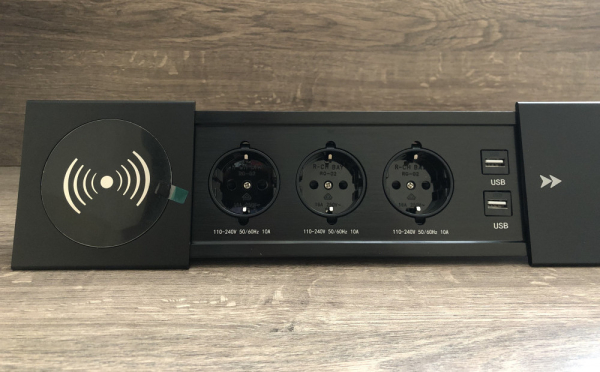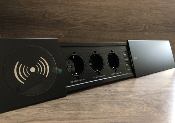 Настільна розетка з бездротовою зарядкою 350×100 мм — стильне і функціональне рішення для переговорних і офісних столів. Вона виводить на поверхню столу все необхідне для сучасної роботи: три розетки 220 В, два USB-гнізда (2 А) і вбудовану бездротову зарядку для смартфона. Все завжди під рукою — достатньо просто покласти телефон на зарядну зону або підключити гаджет через USB. Для роботи USB-портів потрібен додатковий кабель, який потрібно під'єднати до комп'ютера або зарядного блоку. Корпус розетки виконаний з алюмінію з приємною матовою текстурою в елегантному чорному кольорі. Конструкція - прямокутний короб з висувною кришкою, яка легко відкривається вбік, а при розкритті збільшує ширину пристрою до 550 мм. Це не просто розетка, а продуманий елемент сучасного офісу, в якому важливі і зручність, і акуратний зовнішній вигляд. Максимальна сила струму - 2,1 А, потужність бездротової зарядки - 10 Вт.